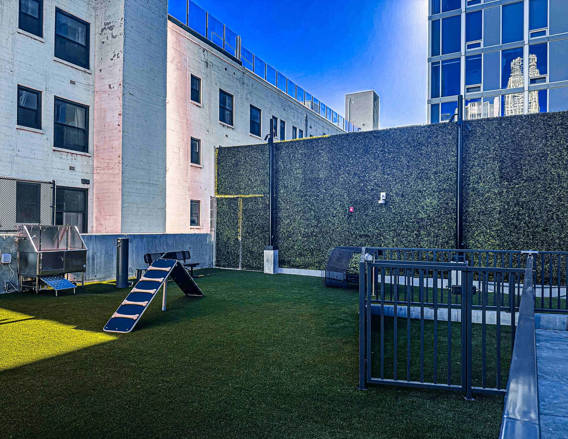 Les aménagements peuvent inclure des découpes autour des arbres ou s'adapter à des terrains arrondis. Pour compléter l'aménagement, la pose de clôture est souvent recommandée afin de sécuriser le périmètre. Outre les parcs, ces solutions conviennent parfaitement pour un contour piscine ou un balcon, offrant un confort thermique et tactile supérieur pour les pattes sensibles.